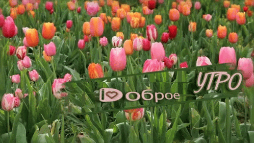 Vibrant pink and orange tulips bloom in a field, with a cheerful 'I love good morning' message.