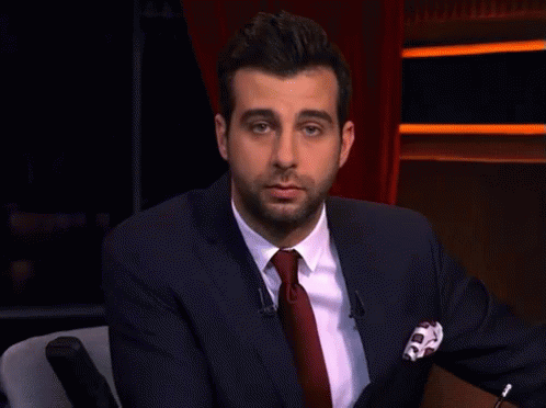 Ivan Urgant yawns widely while sitting in a suit and tie on a TV set.