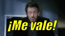 Dr. House (Hugh Laurie) with a wide-eyed, surprised look, exclaiming '¡Me vale!' (I don't care!).