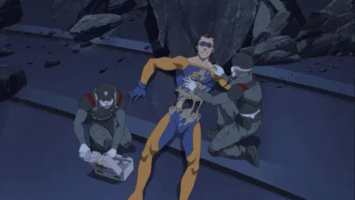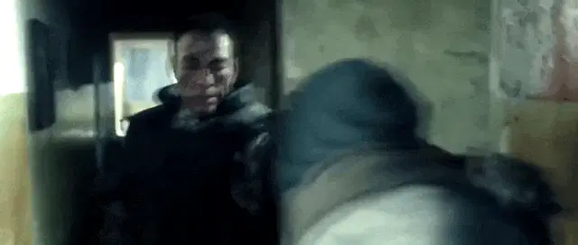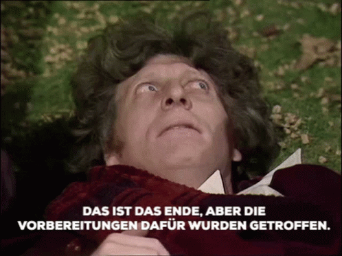 Tom Baker as the Fourth Doctor in Doctor Who, lying on the ground with German subtitles: 'This is the end'.
