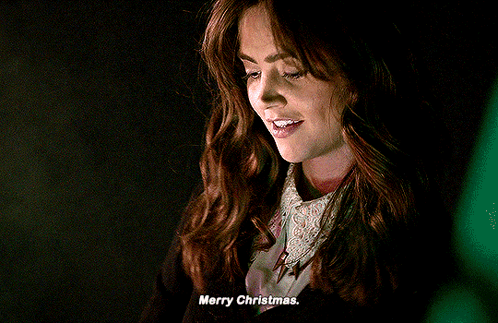 Clara Oswald, played by Jenna Coleman, wishes 'Merry Christmas' with a warm smile in Doctor Who.