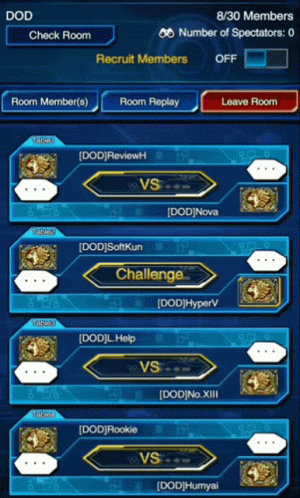 Gameplay footage from Yu-Gi-Oh! Duel Links, showcasing a DOD room with various players, challenges, and duel records.
