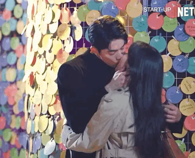 Dodal Namzy, the beloved couple from Kdrama Startup, share a sweet, loving gaze in a modern office setting.