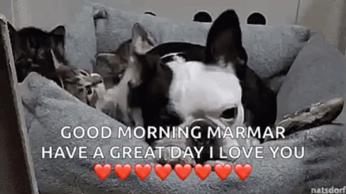 A Boston Terrier dog and a tabby cat cuddle in a pet bed with a 'Good Morning Marmar' message.