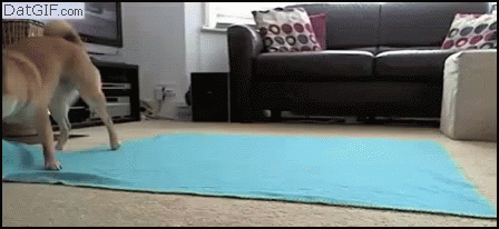 A cute Shiba Inu dog performs a playful barrel roll on a blue mat in a living room.