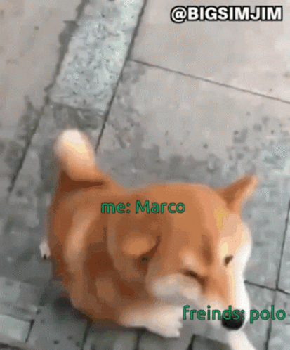 A funny Shiba Inu dog reacts to the 'Marco Polo' game, with text overlay 'me: Marco, freinds: polo'.