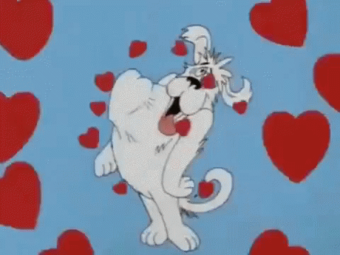 A happy cartoon dog floats amidst red hearts, holding one in its mouth, expressing affection.