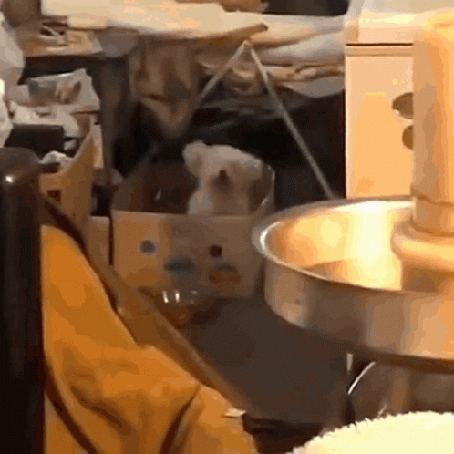 A small white dog playfully bobs its head and body while sitting inside a cardboard box.