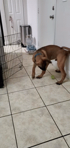 A cute doggo enthusiastically playing with a green ball on a tiled floor.