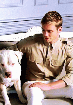 Dustin Mcneer sitting on a couch with a cute white dog, looking at the camera.