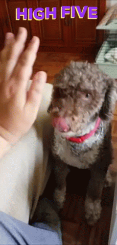 A cute dog with a red collar gives a high five to a person's hand, showing off its trick.