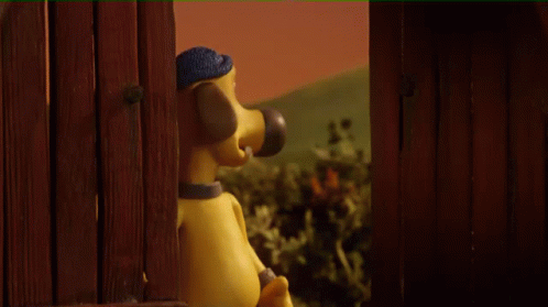 Bitzer, the yellow dog from Shaun The Sheep, looks out from a barn door and blows a sweet air kiss.