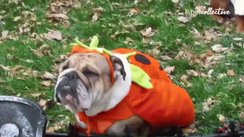 Adorable bulldogs dressed in various Halloween costumes, including pumpkin, chicken, lion, and princess, posing for the camera.