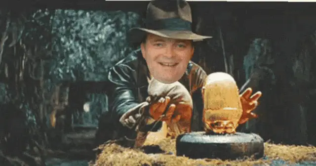 Indiana Jones carefully replaces an ancient idol with a large Dogecoin in a cave.