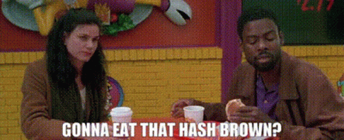 Chris Rock as Rufus asks 'Gonna eat that hash brown?' while sitting at a diner table in a scene from Dogma.