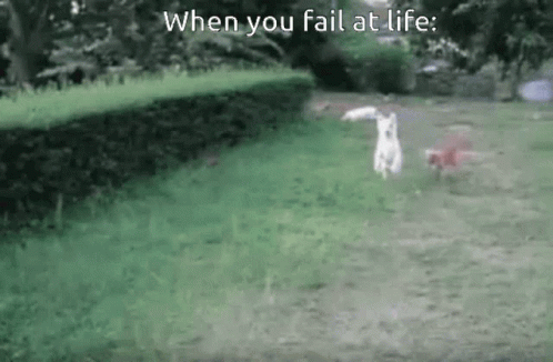 Two dogs run in a grassy field; one fails to jump a bush, accompanied by the meme caption "When you fail at life:".