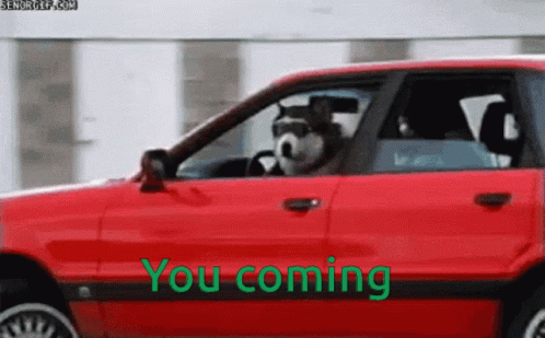 A cool husky dog, wearing sunglasses, appears to drive a red car with the caption 'You coming' overlaid.