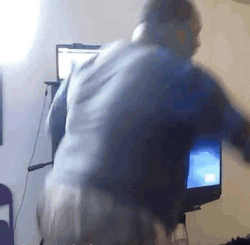 Zach Campbell energetically dances and jumps in front of a laptop, showing excitement.