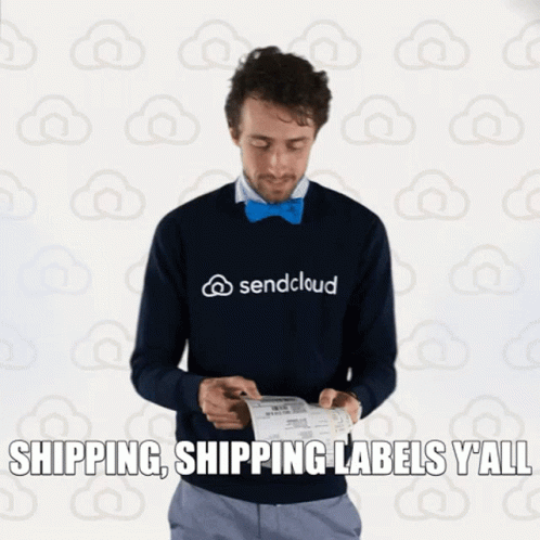 A man in a Sendcloud sweater throws shipping labels like dollar bills, promoting shipping services.