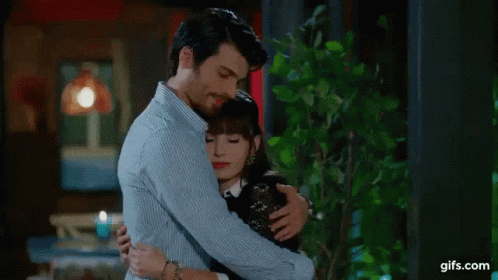 Can Yaman as Ferit and Nazli share a tender hug in the Turkish series Dolunay.
