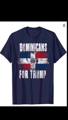 A blue t-shirt featuring the text "Dominicans For Trump" over a distressed Dominican Republic flag, with an American flag in the background.