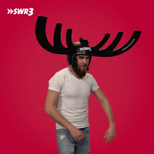 Dominik Elch, wearing a large moose antler helmet, gives two enthusiastic thumbs up to the camera.