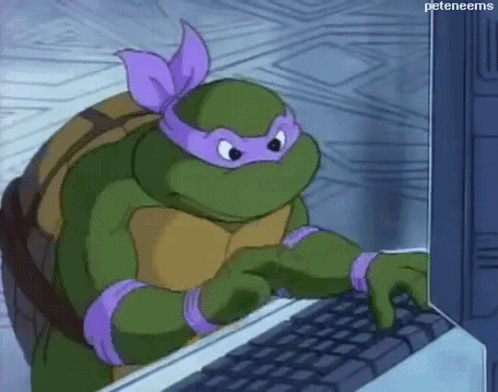 Donatello from Teenage Mutant Ninja Turtles is diligently typing on a laptop, focused on his work.