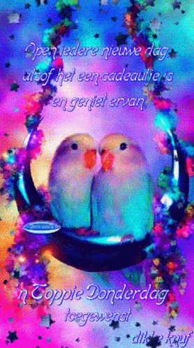 A vibrant greeting card featuring two lovebirds and an inspirational message for a great Thursday, ending with a big hug.