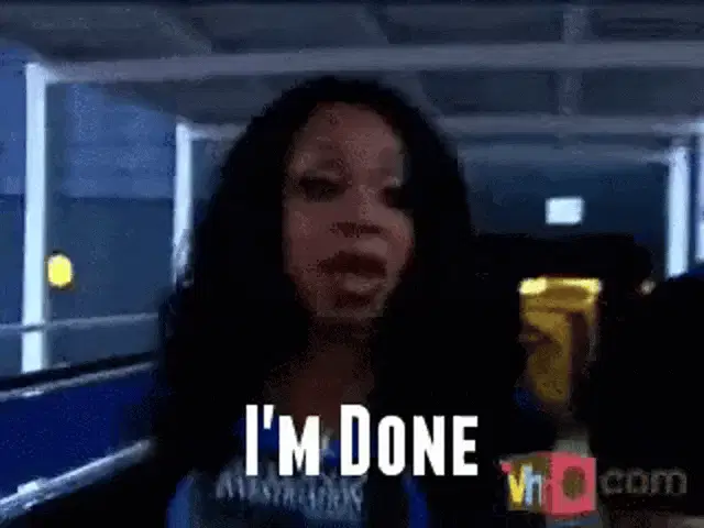 A woman emphatically states 'I'm done with you!' with a determined expression.