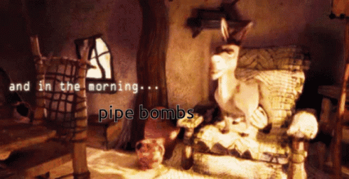 Donkey from Shrek sits on a chair, with the text 'and in the morning... i'm making pipe bombs' appearing.