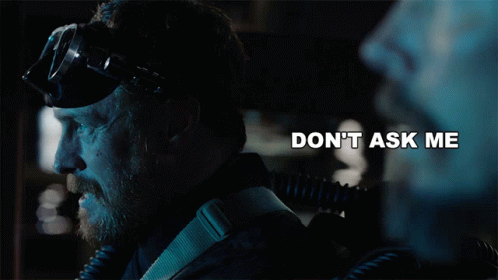 Toby Stephens, wearing goggles and gear, says 'Don't Ask Me' in a dark setting.