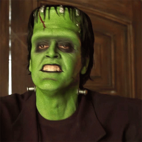 Herman Munster, portrayed by Jeff Daniel Phillips, makes a stern 'Don't!' expression in his iconic Frankenstein costume.