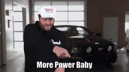 A man from Donut Media enthusiastically exclaims "More Power Baby" in various settings.
