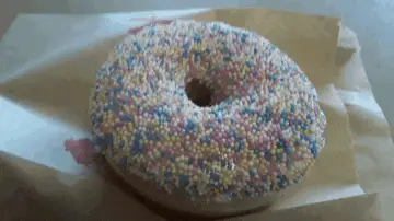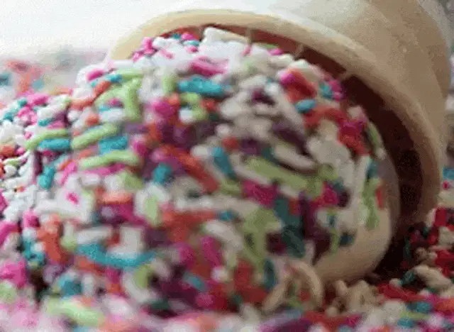 A hand decorates a freshly frosted donut with a shower of colorful sprinkles, surrounded by other delicious donuts.
