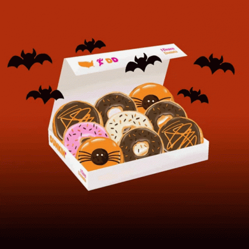 A box of Halloween-themed Dunkin' Donuts with bats, perfect for Homer's trick or treat.