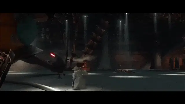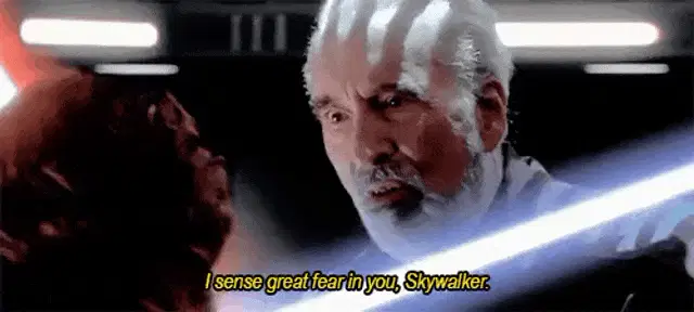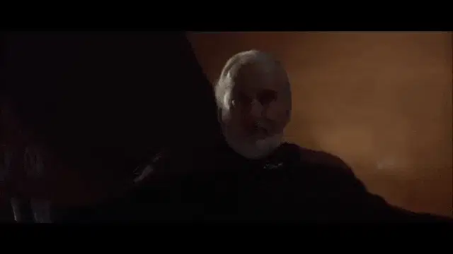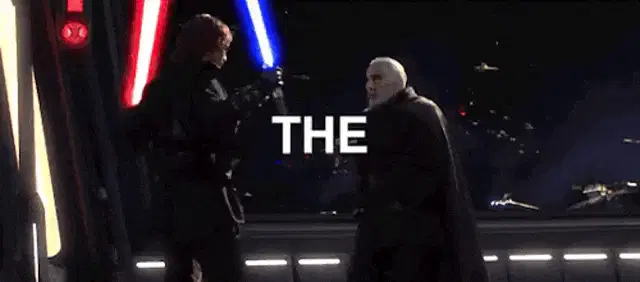 Count Dooku and Mace Windu face off, with the caption 'We'll see' displayed on screen.