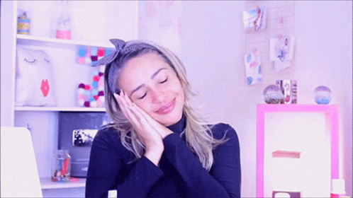 Junia Gabriela smiles sweetly, hands on face, ready for peaceful sleep and sweet dreams.