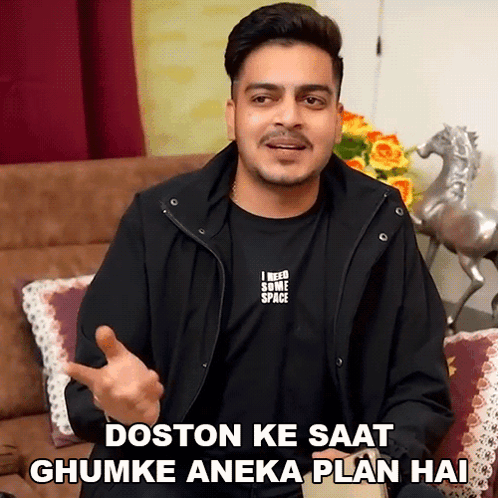 Rachit Rojha sitting on a couch, with the Hindi phrase 'Doston Ke Saat Ghumke Aneka Plan Hai' displayed.