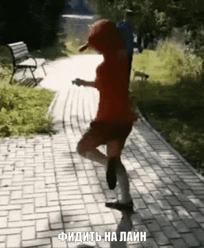 A woman in a red top and shorts dances on a brick sidewalk, with a Russian gaming caption 'FEED THE LINE' at the bottom.