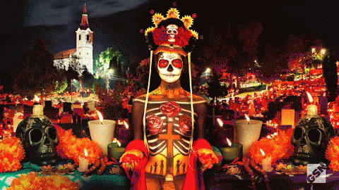Stunning Day of the Dead body paint art on a model, featuring a skeleton design with roses, from the Skin Wars series.