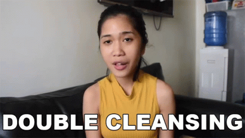 Ak Sabalza explains double cleansing for skincare, sitting on a couch with the topic displayed on screen.