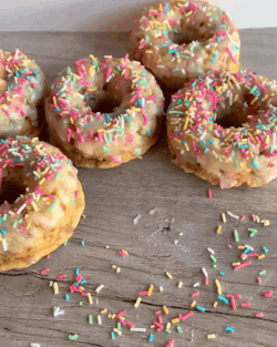 Close-up of colorful doughnuts with sprinkles, one being picked up and shown with a bite taken out.