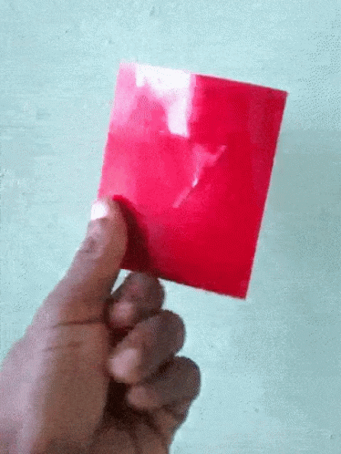 A hand flips a red card to reveal a white triangle with a blue center, resembling a play button or downsign logo.