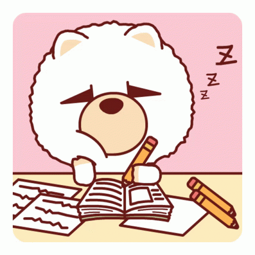A cute cartoon bear struggles to stay awake, dozing off while attempting to read or write in a notebook.