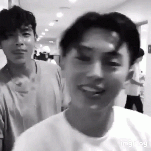 DPR Hong Dabin (DPR Live) smiling and making a hand gesture in a hallway, captured in black and white.