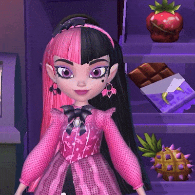Draculaura G3 from Monster High makes a cute, shy gesture, surrounded by sweet treats like chocolate and strawberries.