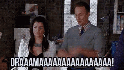 A man from Happy Endings dramatically shouts 'DRAAAAAAMAAAAAAAAAAAAAA!' with a woman looking on.