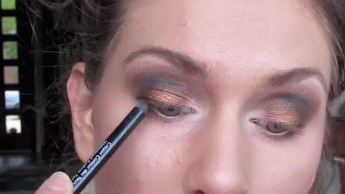 Close-up of a woman applying black eyeliner to her lower lash line, completing a dramatic smokey eye makeup look.