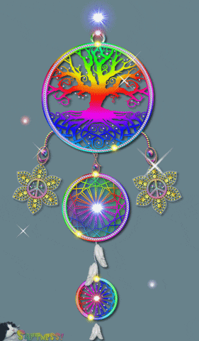 A vibrant, animated dream catcher featuring a rainbow-colored Tree of Life, peace signs, and sparkling details.