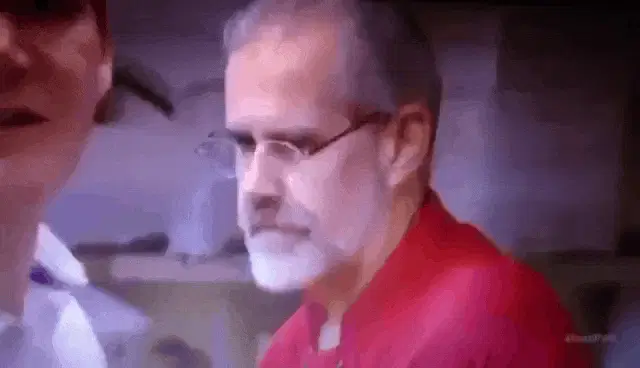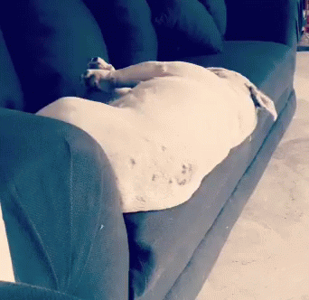 A light-colored dog peacefully curled up and sleeping on a dark couch, possibly dreaming.